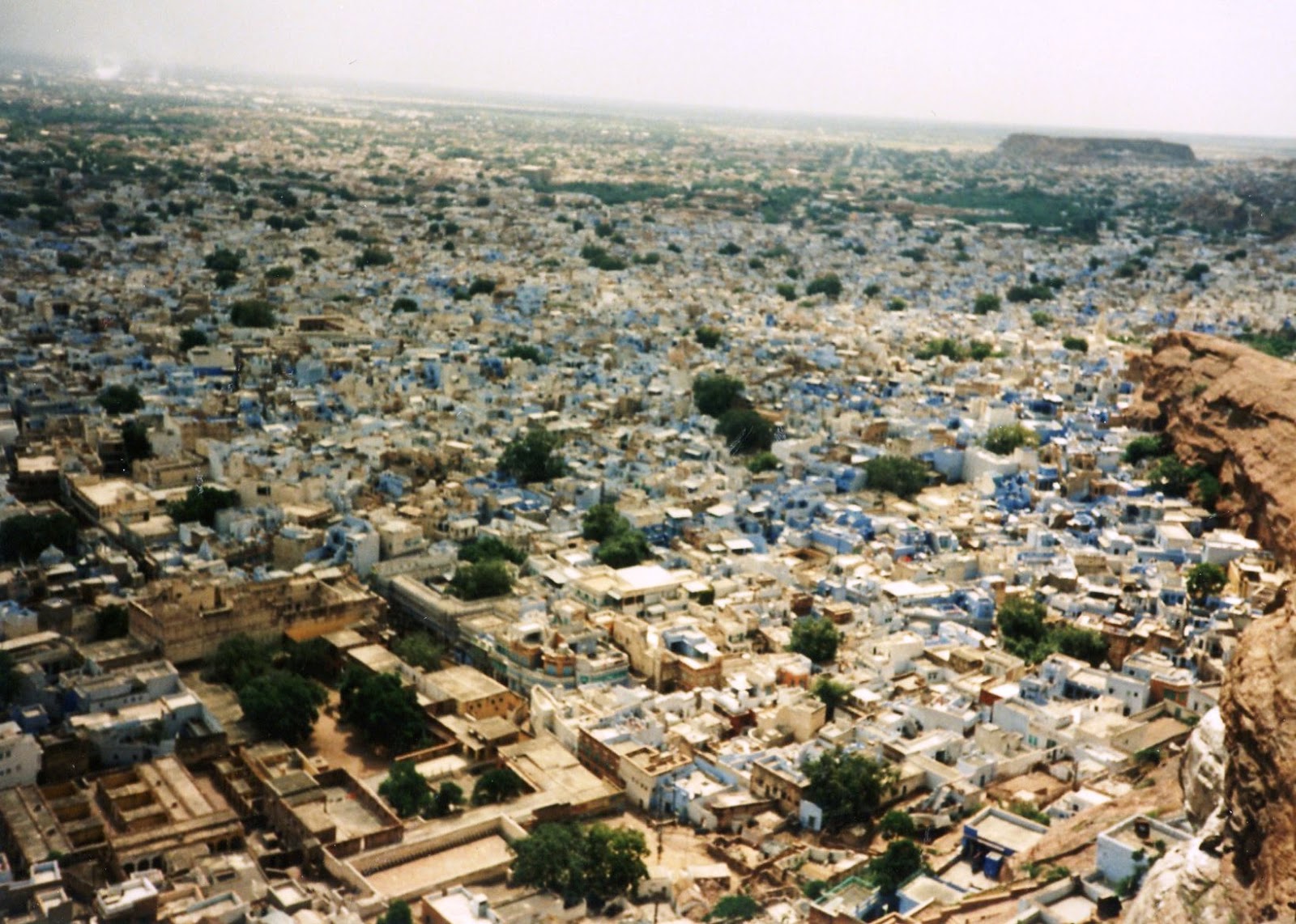 We arrived in Jodhpur, the second largest city in Rajasthan, after an overnight (15-hour) train journey from Udaipur. Indian trains stop frequently, and one stop seemed to last for three hours. During one stop, hordes of children banged on the windows and doors of the train compartment–we felt like animals in a zoo. Outside Jodhpur is a desert landscape with green brush. The word jodhpurs owes its etymology to this city.