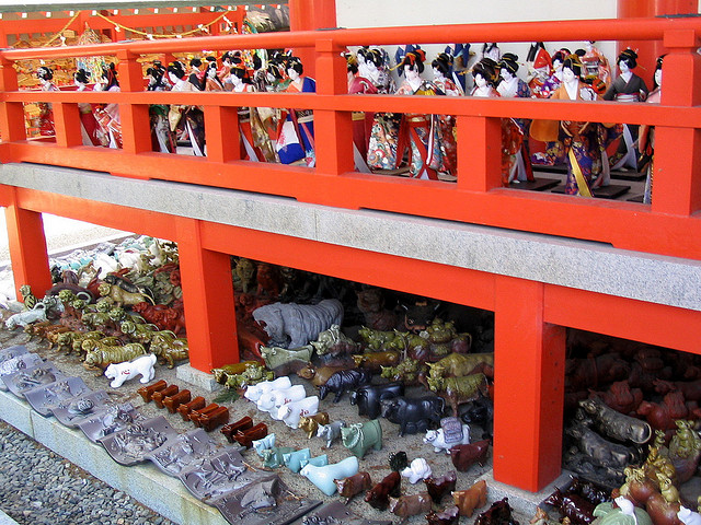 Kada, a fishing town, was farther away from Wakayama (where I lived during my first year in Japan) than Isonoura Beach, but it was a much more pleasant destination. Kada Beach was less crowded and cleaner, and it had a fascinating shrine (Awashima), which has become a sort of doll repository. It’s believed that dolls have spirits and you can’t just dump them in the garbage. The shrine is also a popular place to pray for relief from “women’s issues,” infertility, miscarriages, etc., and to remember and honor lost babies. To us, it was a picturesque spot!