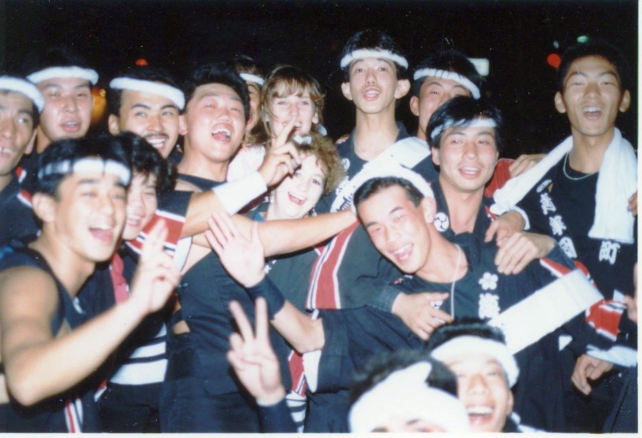 A few months after arriving in Japan, we went to Kaizuka for our first Japanese festival, which was unforgettable. Hundreds of people in hapi coats filled the streets, pulling large shrines through the streets of the city, yelling “Sore-ya!” The streets were festooned with strings of colorful paper lanterns, and street vendors sold festival food such as yaki-tori (grilled chicken), tako-yaki (octopus balls) and taiyaki (fish-shaped pastry with red bean filling). As gaijin (foreigners), we were quite an attraction, even more so than usual. The Japanese pulled us into the lines and encouraged us to help pull. I felt like a rock star. It was a wild party, helped along by plentiful sake. Unfortunately, I also experienced my first (and not last!) Japanese groping during the festival–a dirty old toothless man kept kissing my hand, and then he grabbed one of my breasts. Fortunately my two tall friends helped fend him off. With the exception of that incident, the festival was great fun.