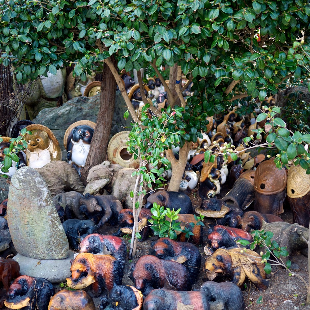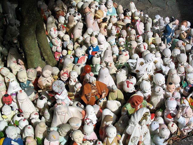 Kada, a fishing town, was farther away from Wakayama (where I lived during my first year in Japan) than Isonoura Beach, but it was a much more pleasant destination. Kada Beach was less crowded and cleaner, and it had a fascinating shrine (Awashima), which has become a sort of doll repository. It’s believed that dolls have spirits and you can’t just dump them in the garbage. The shrine is also a popular place to pray for relief from “women’s issues,” infertility, miscarriages, etc., and to remember and honor lost babies. To us, it was a picturesque spot!