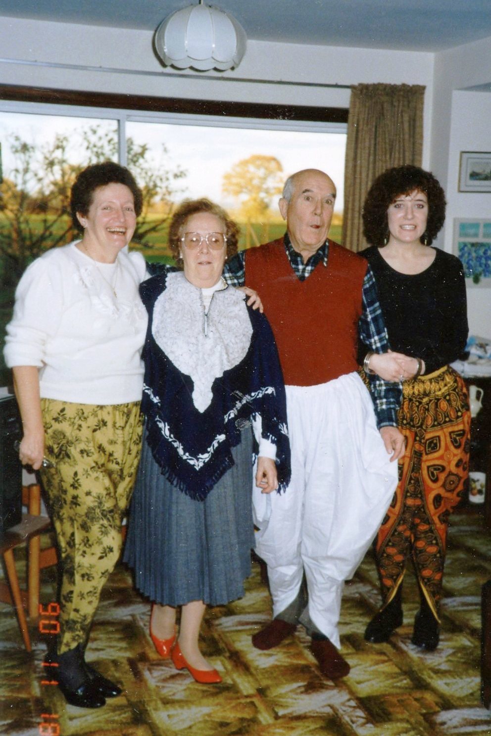 | Mike’s parents, sister, and Aunty Betty wearing jodhpurs from India |