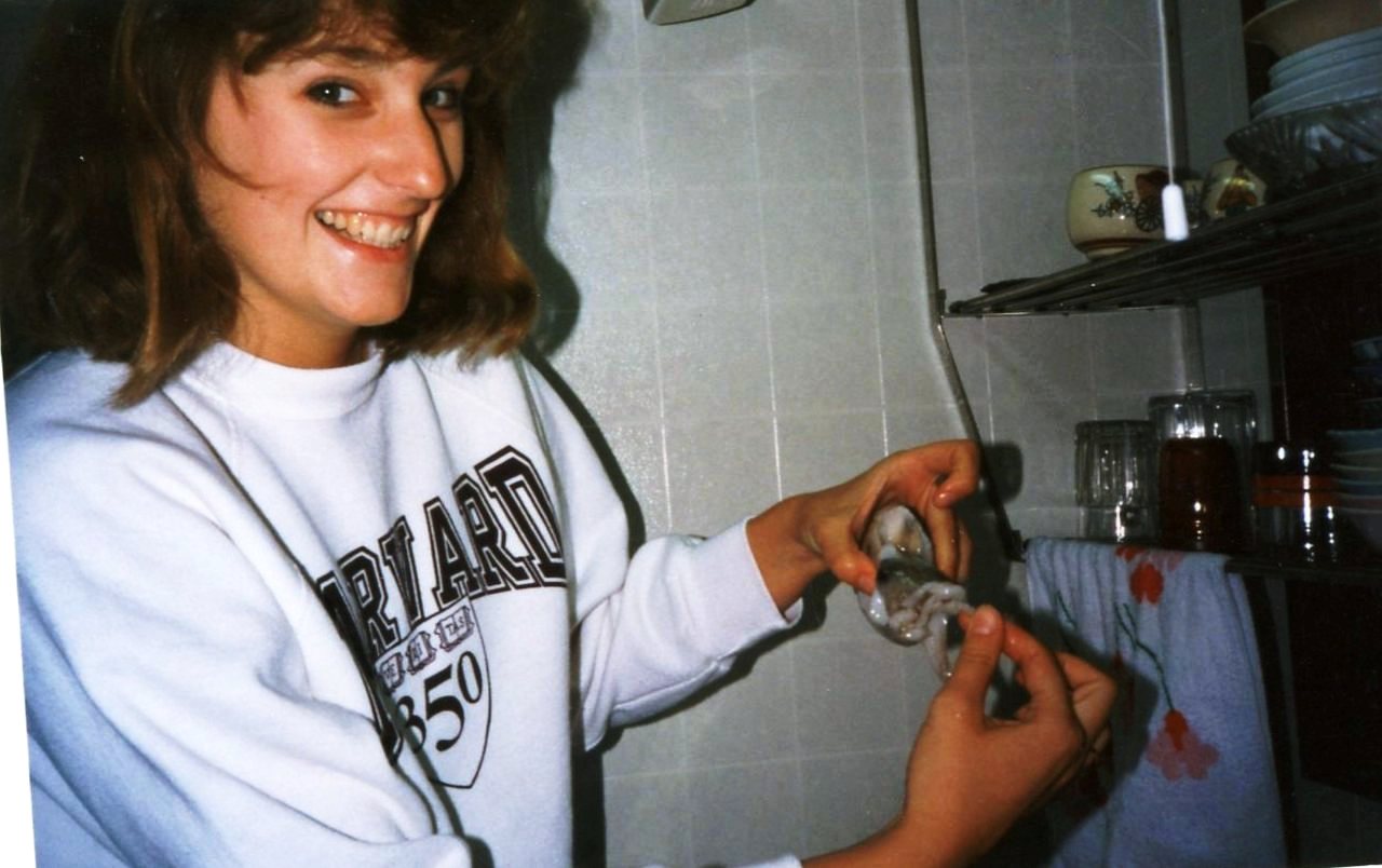 Debbie rocking out to her walkman in the tiny little bedroom we shared that first month
