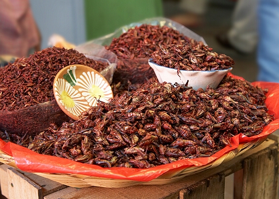 The food in Oaxaca is amazing. We found it interesting that food is served with bread rolls instead of tortillas–not a tortilla to be found, really! Oaxaca does a lot of moles, which we love. And one night Mike sampled another Oaxacan delicacy, deep-fried grasshoppers. Crunchy…tastes like chicken!