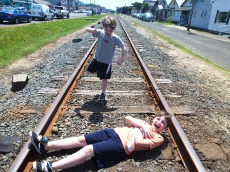 | The classic stranded-on-the-railway shot, Nicholas ready to rescue! |
