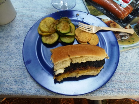 Dinner: Sausages and hot dogs, chips, and garlic-stir-fried zucchini