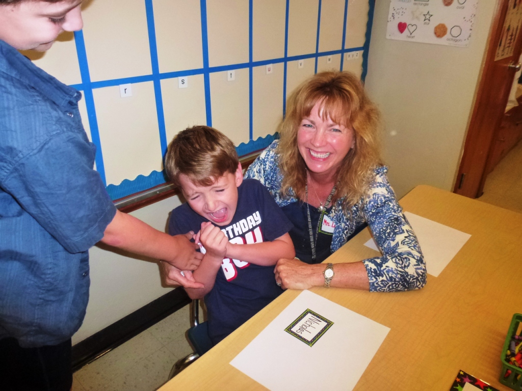 We walked Nick to his class– his teacher had both Chris and Kieran too, and we love her! (He’s actually laughing rather than crying in this shot) |
