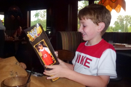 Cena had lost, Nicholas woke us up WAILING and inconsolable. He knows that WWE is all planned ahead and total theater, and he knew that Cena has to have elbow surgery and would probably be sidelined, but he was upset anyway. He’s recovered now, fortunately. When he turned seven at the beginning of the month, he received many John-Cena- and WWE-themed gifts–they were the only things he asked for.