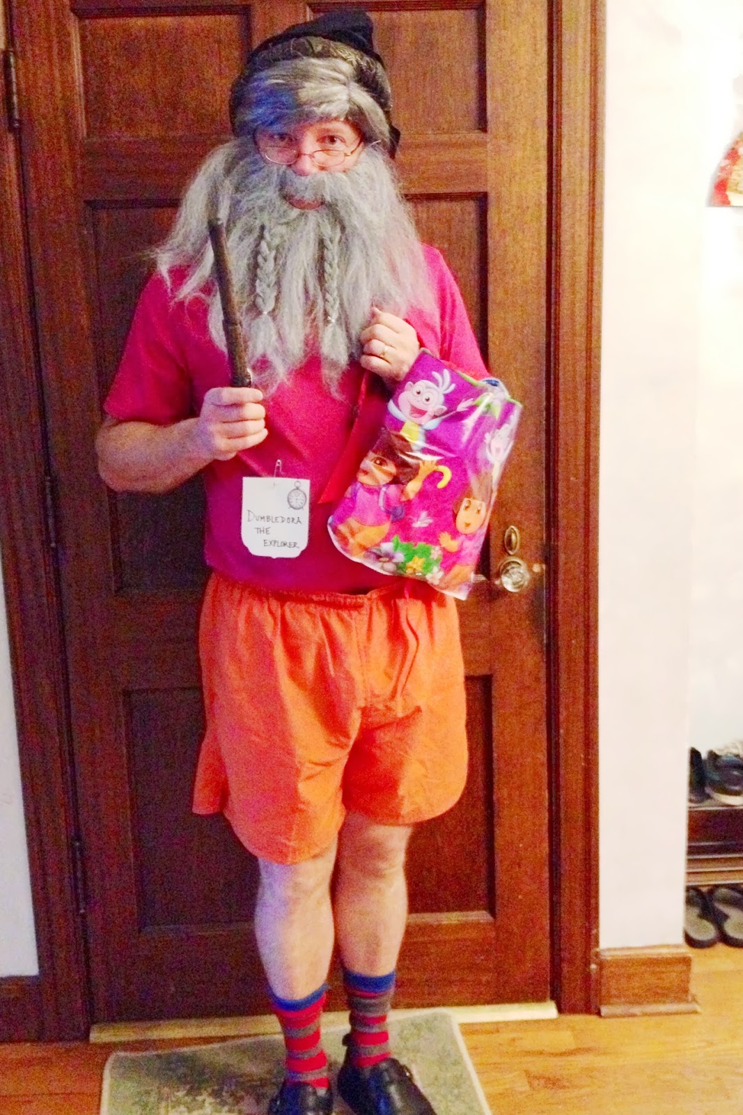 | Mike dressed up for the first time in years: as Dumbledora the Explorer |