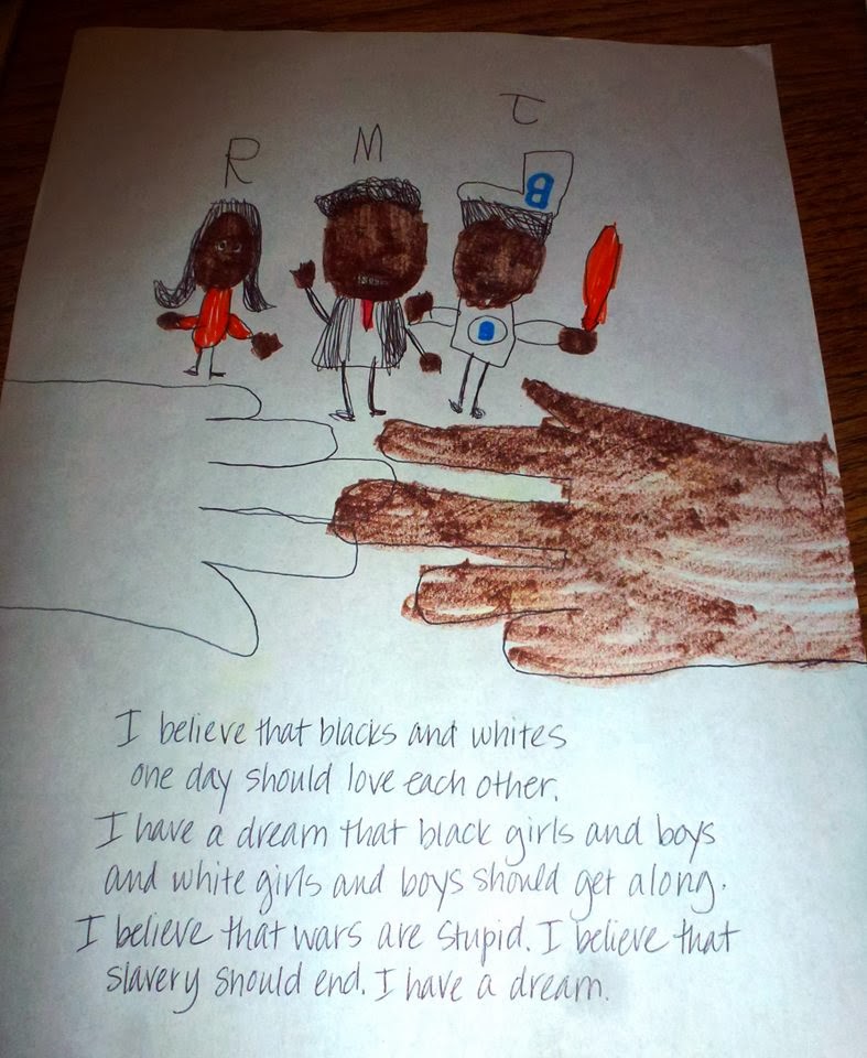 I don’t remember learning much about the civil rights movement or Martin Luther King Jr. as a child. I am delighted to see that this has changed. Not only do we have a national holiday to honor Dr. King, but the kids also study him and his work in class, have school-wide assemblies, and write about his work. We also have a lot more diversity in our schools, even though we are still white bread Oregon.