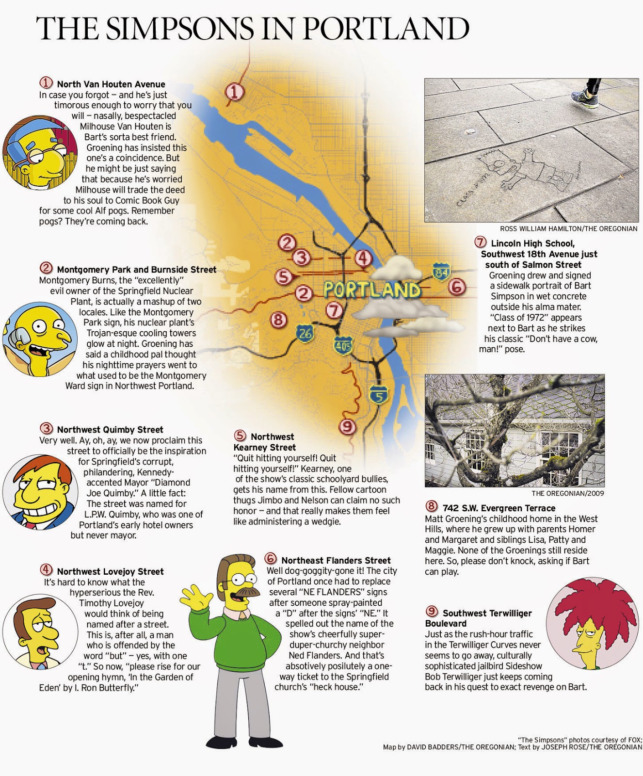 My teenager, Chris, used to be a devoted Simpsons fan before moving onto other things. Matt Groening hails from Portland, and the names of many characters on the Simpsons–Flanders, Kearney, Lovejoy, etc.–come from Portland street names. Groening intended to “name every character after streets in Portland, but we were in a hurry so I dropped the idea.”