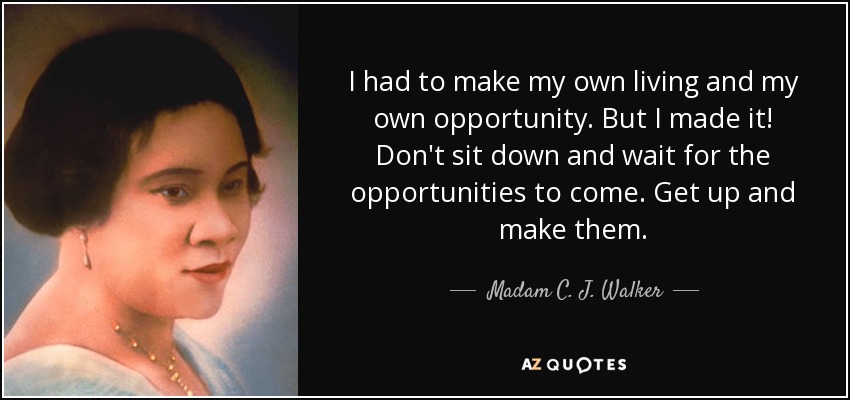 “I am a woman who came from the cotton fields of the South,” Walker said. “From there I was promoted to the washtub. From there I was promoted to the cook kitchen. And from there I promoted myself into the business of manufacturing…I have built my own factory on my own ground.”