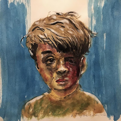 | Evening Drawing-Meditation: “This is YOUR beloved child – With whom I am well pleased. Listen to them.” (Reference photo from http://www.bbc.com/news/world-middle-east-37116349 showing 5-yr old Omran Daqneesh after he was rescued from a destroyed building after an air strike in Aleppo.) |