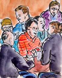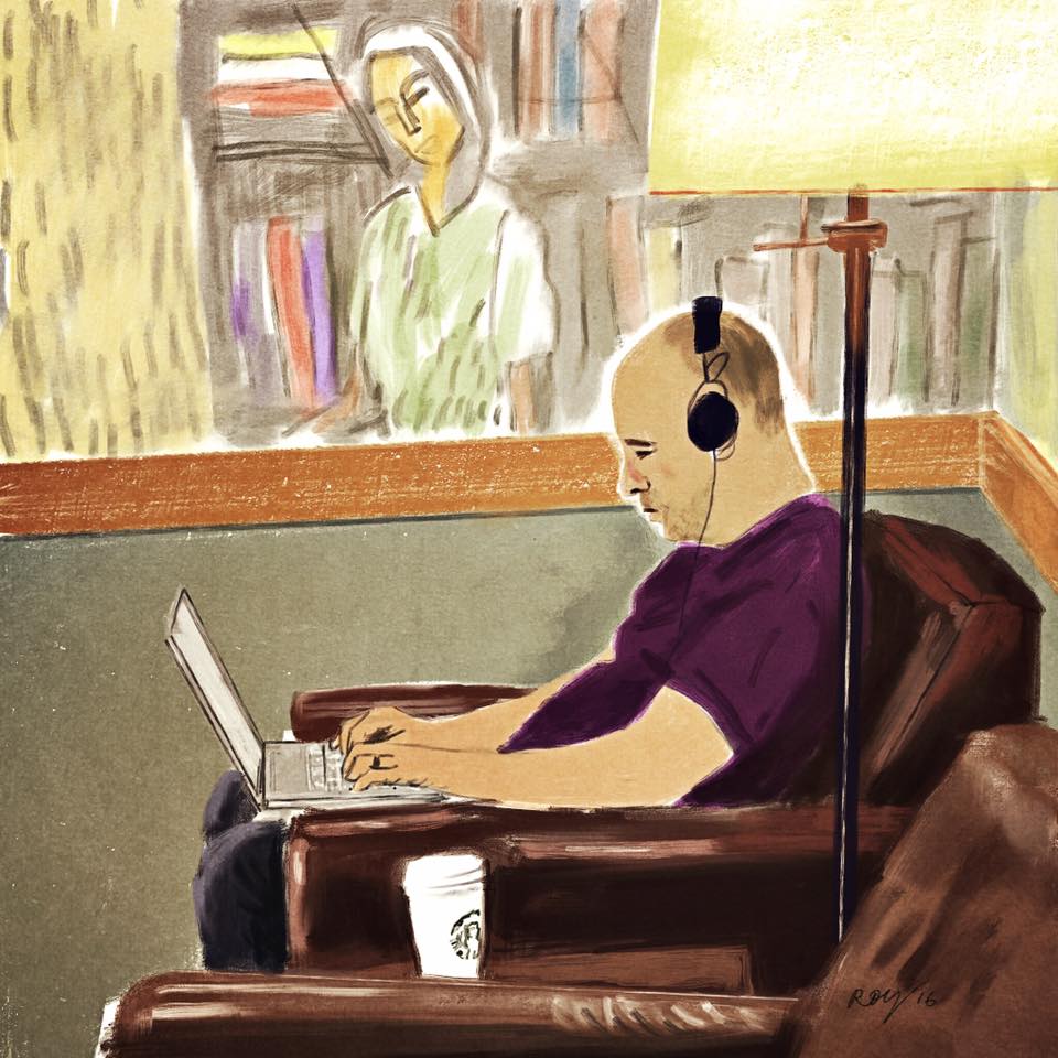 Roy has been chronicling his thoughts and feelings in art for many years, and a few years ago he began sharing his painted vignettes from visits to Starbucks on Facebook. Many of these paintings were accompanied by beautiful words as well, like this one: