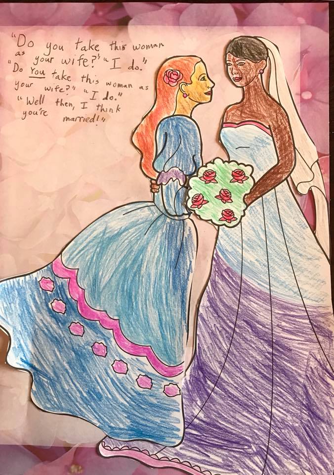 My mom gave her a new princess coloring book, and my daughter didn’t like that it was all opposite-sex couples, so she cut two of them out to make a same-sex wedding.