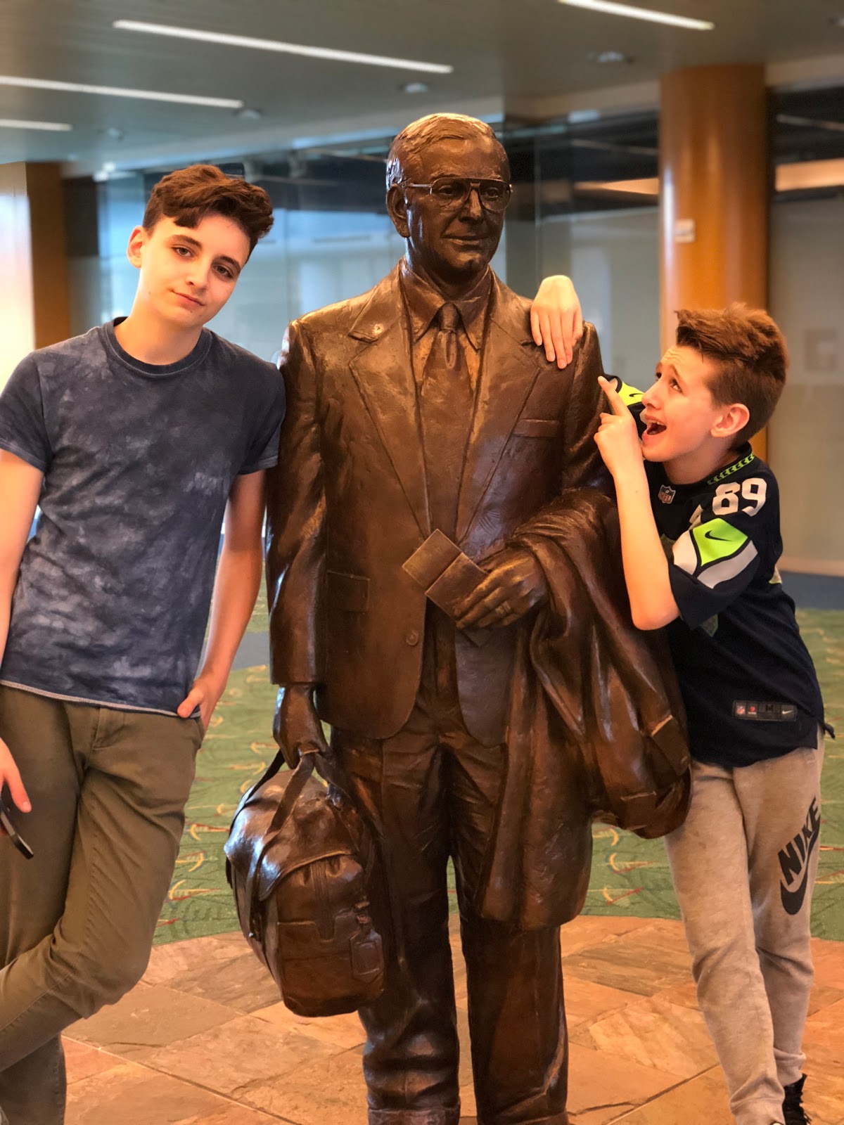 Clowning around with the statue of former Oregon governor Vic Atiyeh