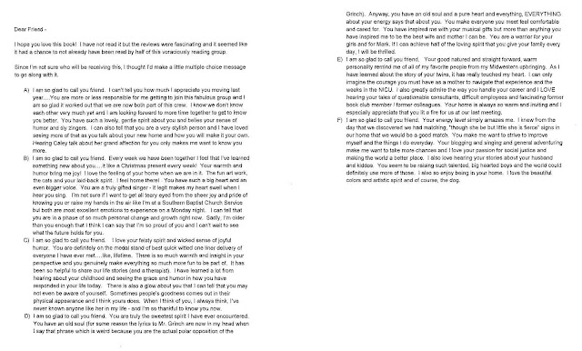 One of our newest members, Amy, is a gifted and witty writer, and she wrote a multiple-choice list for whomever chose her book. Of course, we had to read it all out loud. And a few of us got misty-eyed!