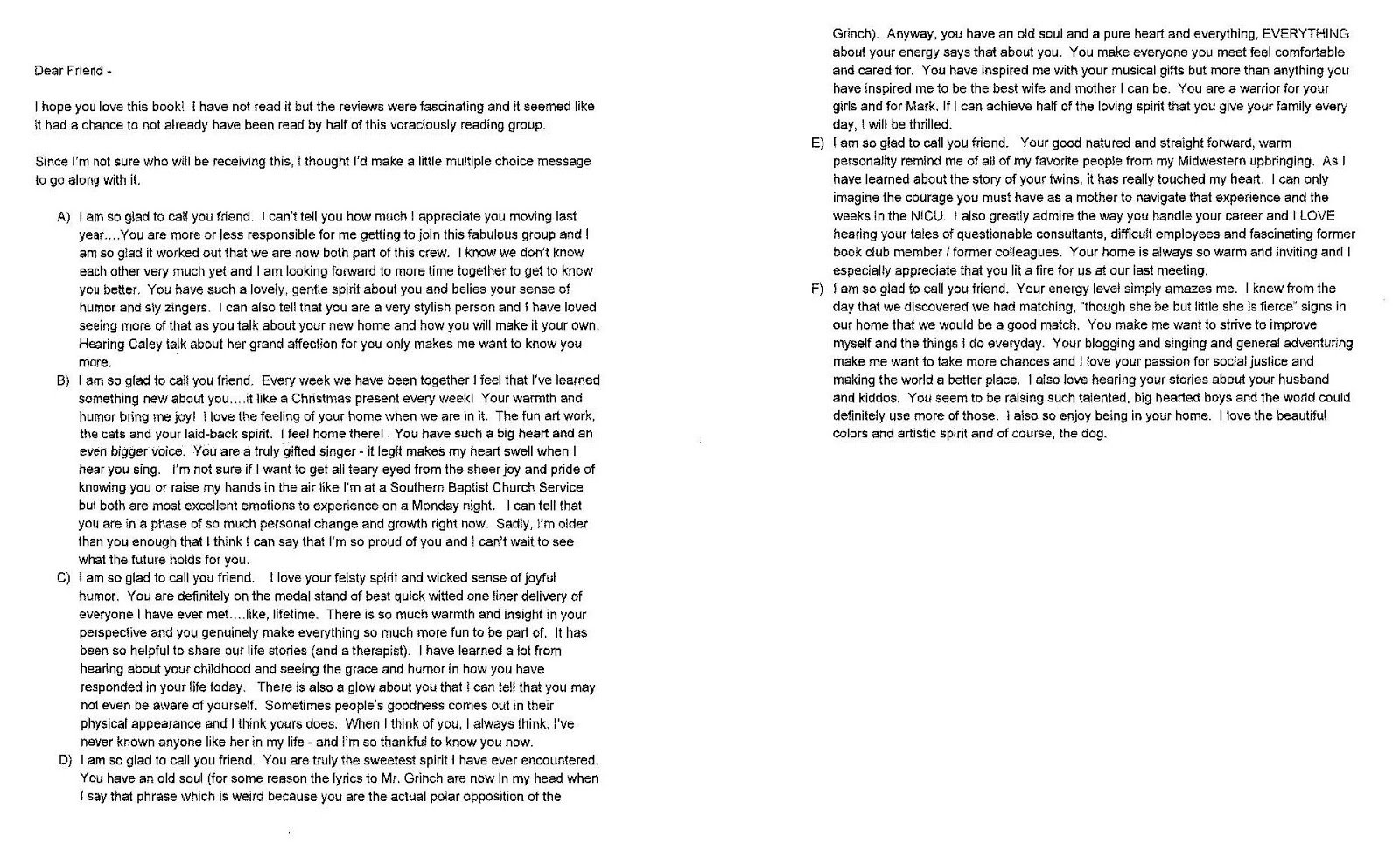 One of our newest members, Amy, is a gifted and witty writer, and she wrote a multiple-choice list for whomever chose her book. Of course, we had to read it all out loud. And a few of us got misty-eyed!