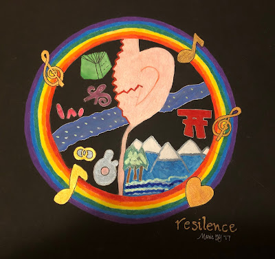 A few weeks after I started wearing a hearing aid, I was fortunate to take an art class on the mandala…coincidentally taught by a highly talented artist who has a much more severe hearing loss than I do. Mandalas, when done well, are a journey of the self. My mandala illustrates the injury to my ear, along with symbols of the things that are important to me, the value I get from using all of my senses effectively, and the rainbow around my life…summed up in the word “resilience,” for I will not let myself be hobbled by a hearing loss. Through my cholesteatoma trials, I realized that resilience is the theme of my life and it is my motto.