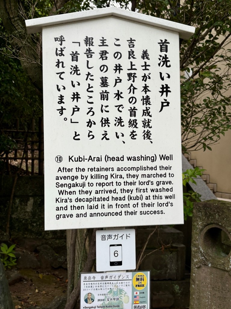 We started out with Sengakuji Temple, dedicated to 47 ronin (Samurai without a lord) who committed seppuku (death by disembowling). On a snowy night on December 14, 1702, the 47 Ronin avenged their master by killing lord Kita in his mansion. Afterwards, they paraded with Kira’s head through the streets before taking the head to Sengakuji. They were later sentenced to commit seppuku.