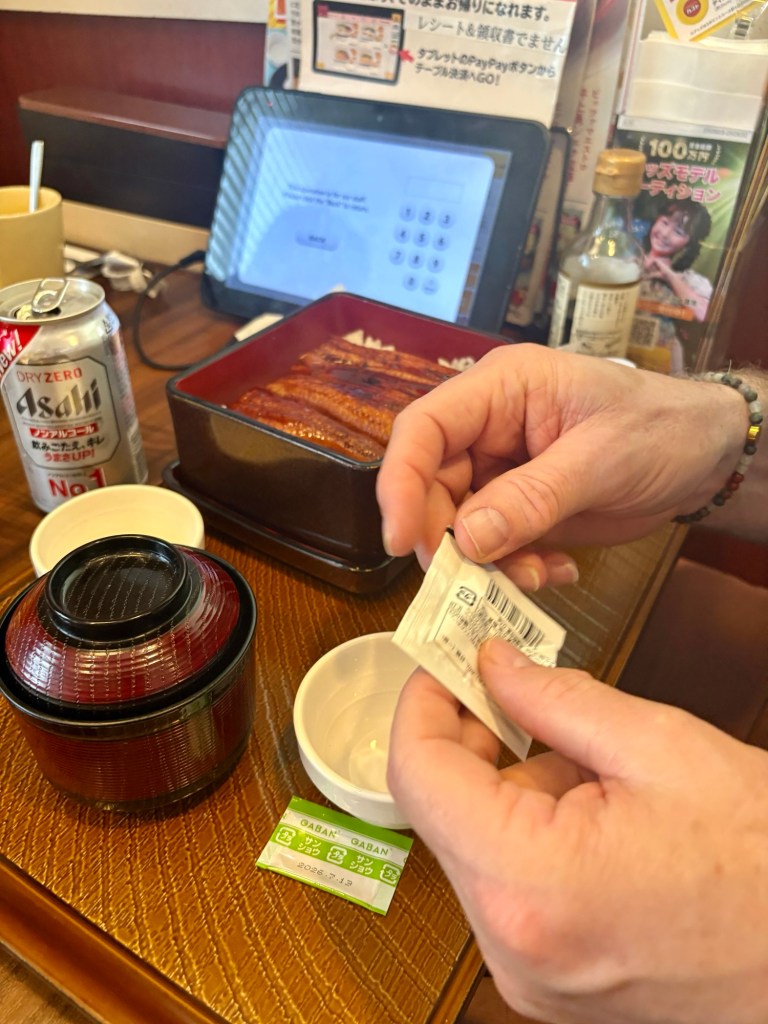 After all that head washing and seppuku, we headed for lunch in a family restaurant, which was completely automated! We ordered our food electronically, it came to us via robot, and we also paid electronically. Mike had unagi (eel), a delicacy here.