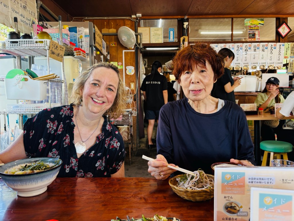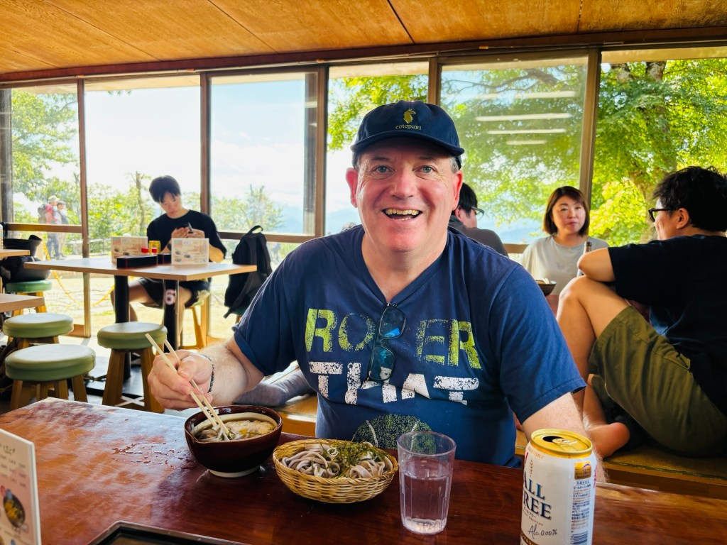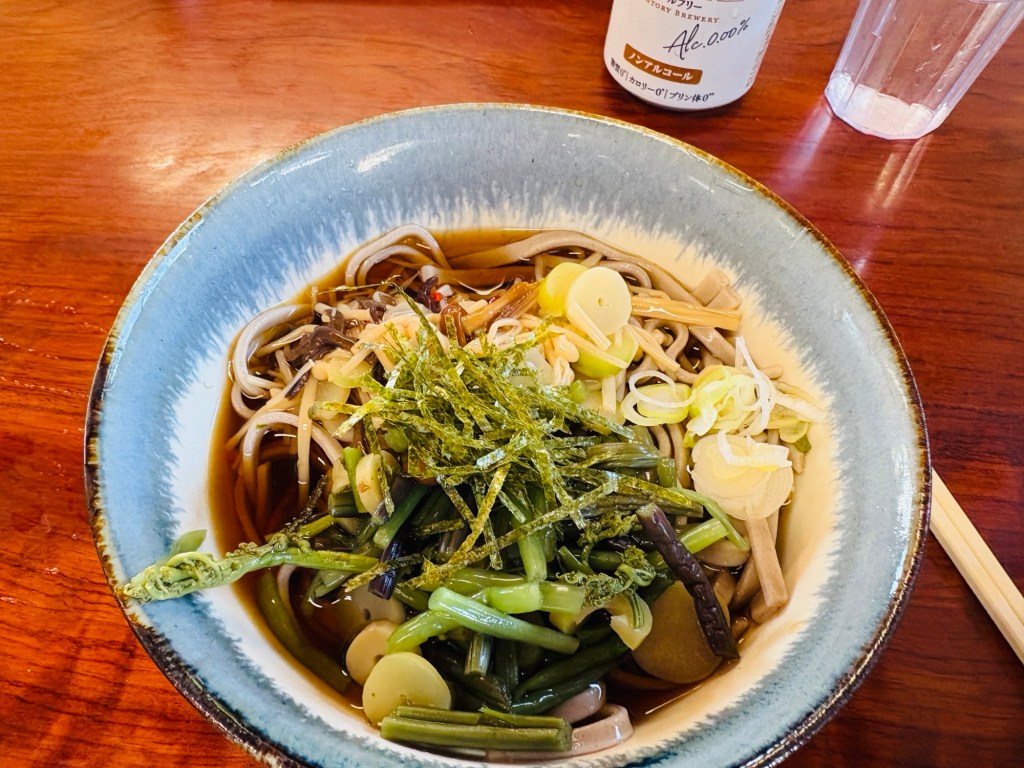 Hot and tired, we had soba and nonalcoholic beer in a restaurant at the top. I was happy to have “sansai soba” with mountain vegetables.
