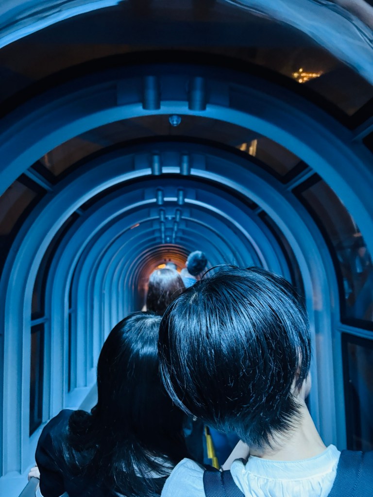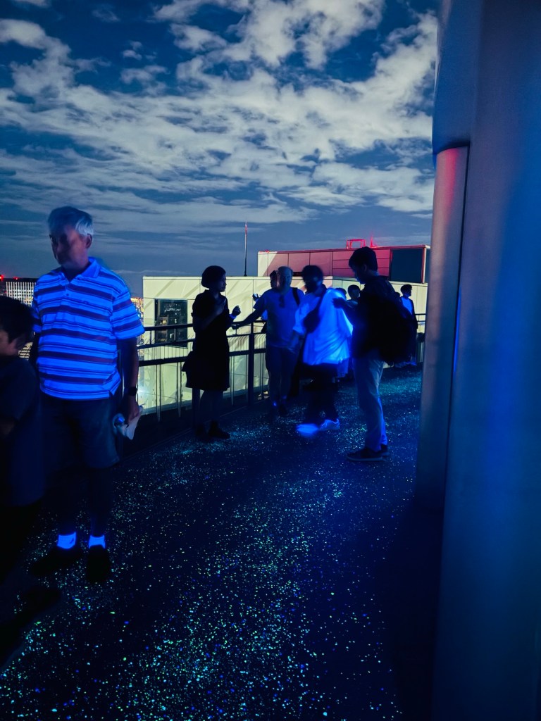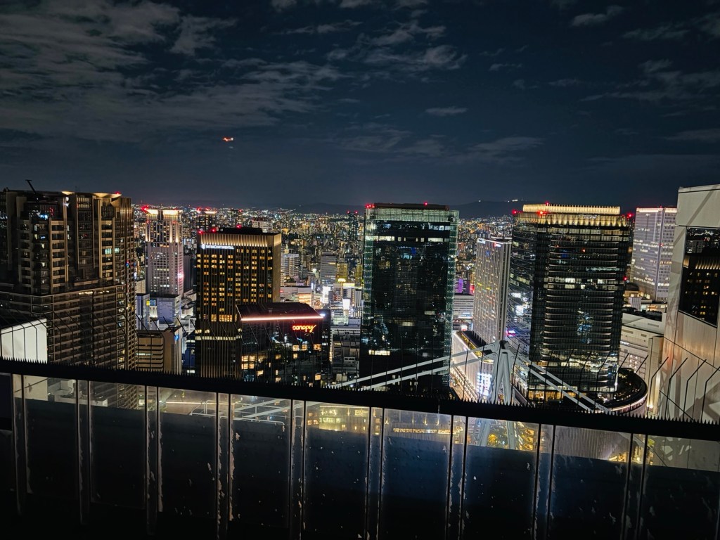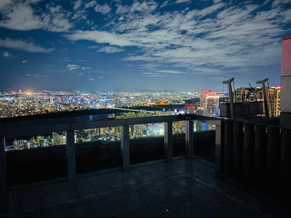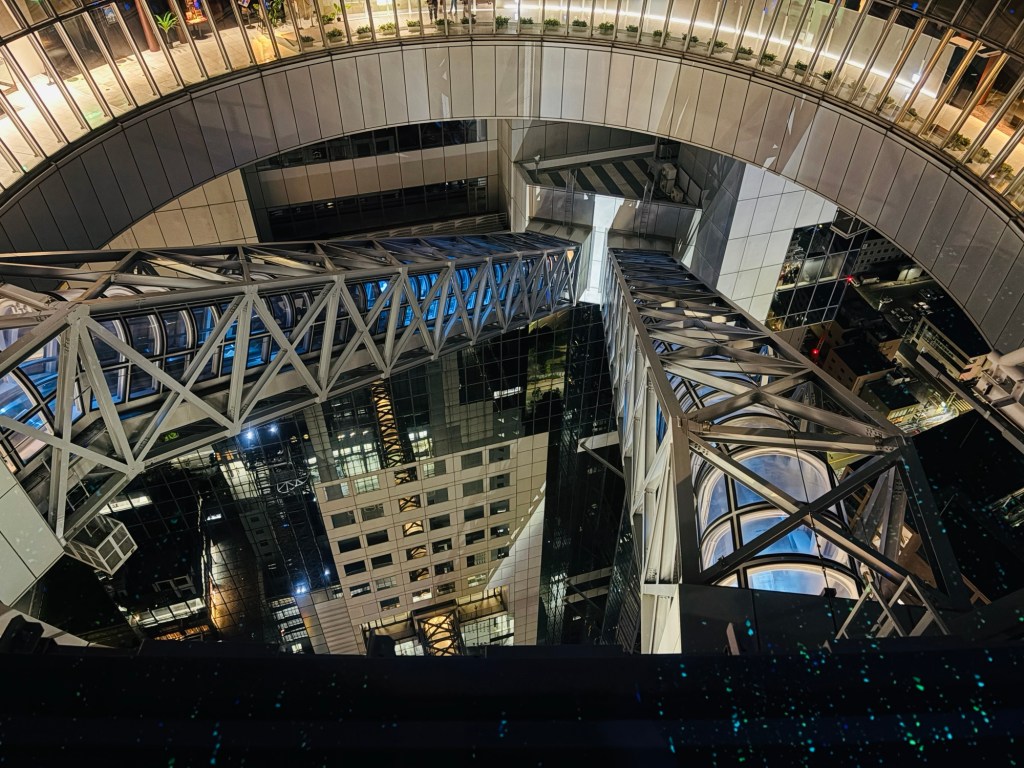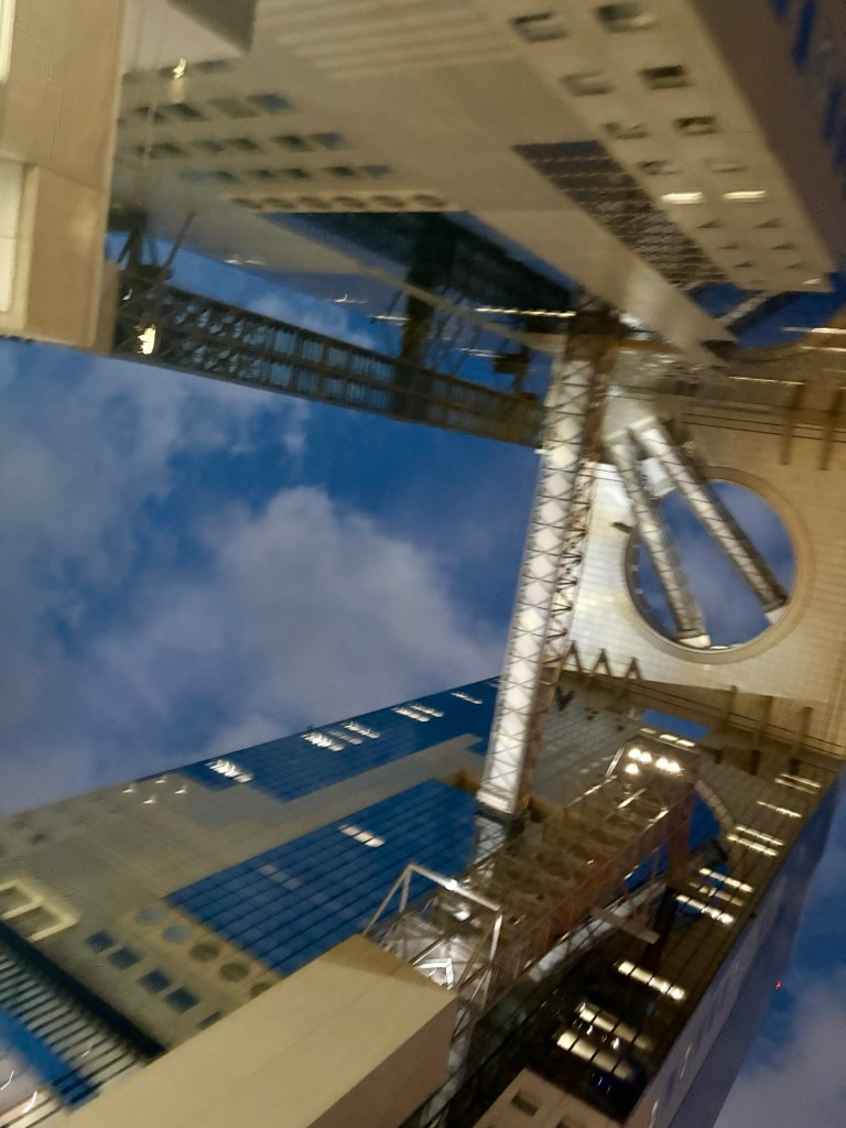Umeda Sky is a pair of 40-story towers joined at the top by the dramatic, donut-shaped Kuchu Teien (Floating Garden) Observatory. Reached by glass-walled escalators, the open-air rooftop offers a 360° panorama, from the Yodo River and Osaka Bay. We had no clue how mobbed it would be, and we ended up waiting in a crowded line for 1/2 hour or more to go up…and 15 minutes to go down.